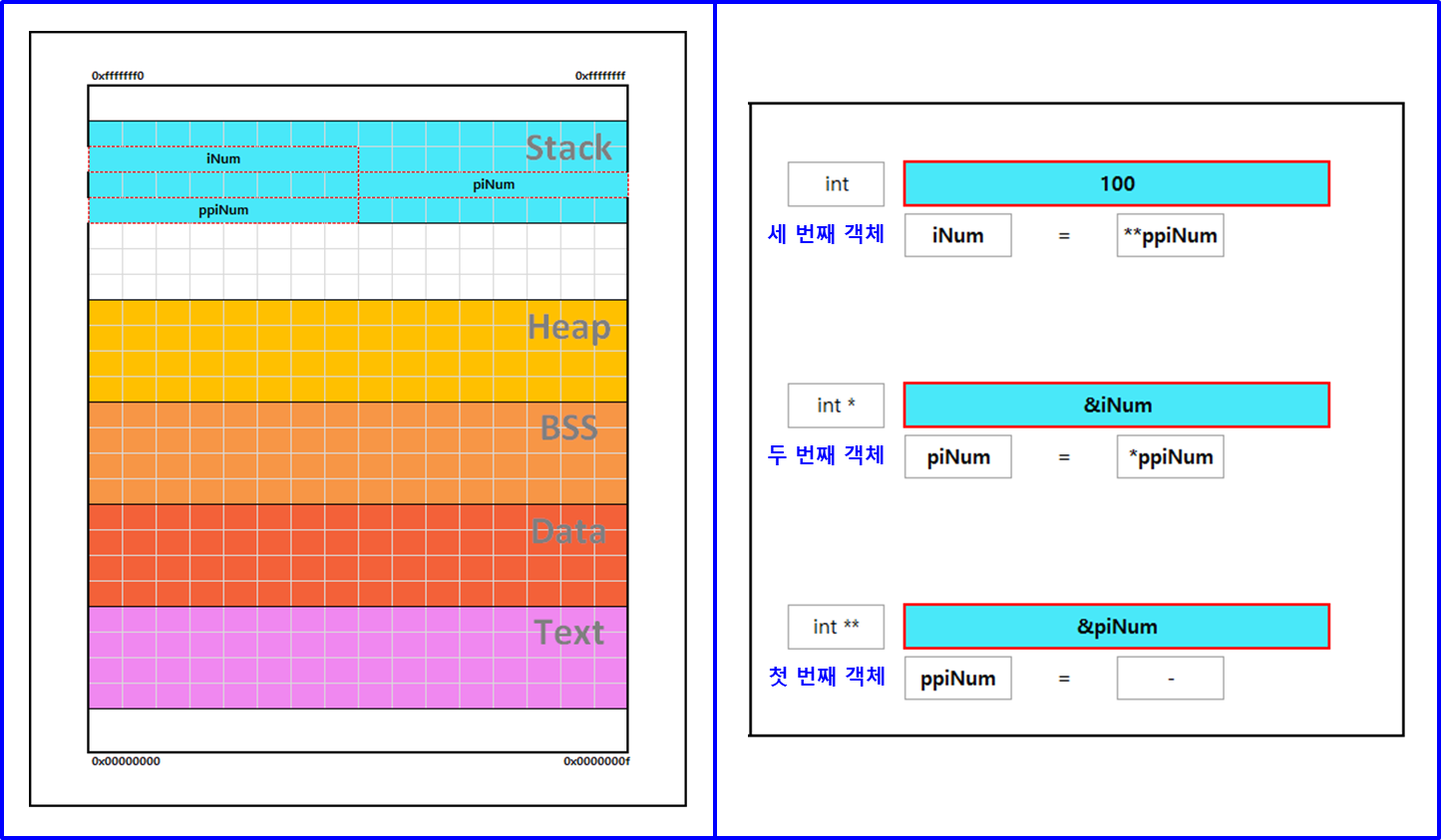 int *piNum = &iNum; // stack에 int * 변수 piNum 선언되고, &iNum으로 초기화