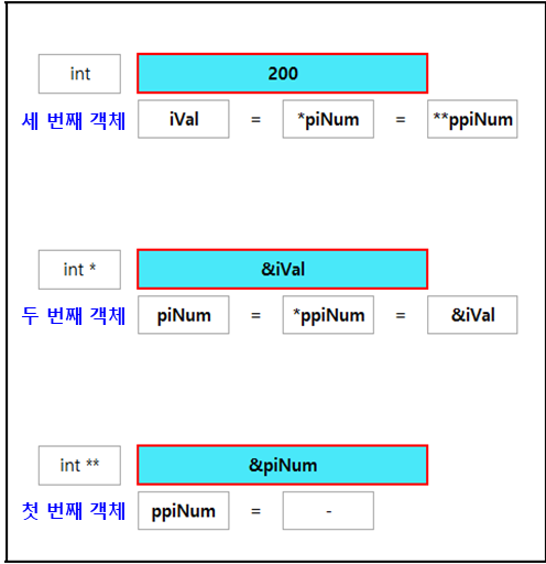 int **ppA; // 실제 코드 상에 사용될 때 모습, ppA : 첫 번째 객체, *ppA : 두번째 객체, **ppA; 세번째 객체