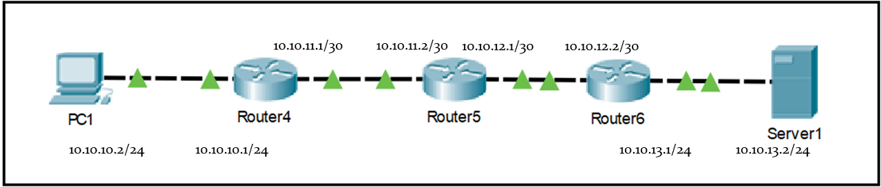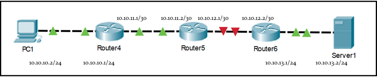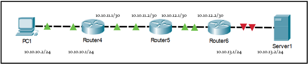 우선 PC1에서 Server1으로 ping이 되도록 static 라우팅 설정을 해줍니다. "사랑에는 일방통행이 있을지라도, 라우팅에는 일방통행이란 없다" 당연한거 아임까? PC1과 Server1이 서로 통신이 되도록 하려면, 쌍방통해이 되도록 가는 길, 오는 길을 각각 모두 뚫어 주어야 합니다. 가는길은 PC1, Router4, Router5에 각각 static routing 설정을 해 주어야 합니다. Router6는 스태틱 라우틸 설정 안하나요? 이제는 이런 질문 하면 안됩니다. 마지막 hop 라우터는 host와 Connected 라서 따로 routing 설정을 안해도 된다는 사실을 이제 우리는 모두 알고 있습니다. 가는길을 설정 했으면, 오는 길도 설정합니다. Server1, Router6, Router5에 static route 설정을 합니다. Router4는 당근 PC1과 Connected이므로 라우팅 설정 불필요임돠. 자 이렇게 가는 길, 오는 길 쌍방을 뚫었습니다. Ping 이 잘 가겠지요? 네, 잘 갑니다.