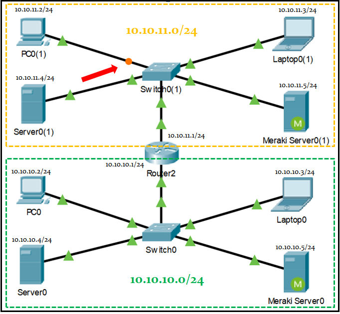 Test를 위해서 Router2의 10.10.11.0/24 LAN에 연결된 interface Gi0/1을 shut down 하고, PC0에서 PC0(1)로 ping을 수행해 보겠습니다.