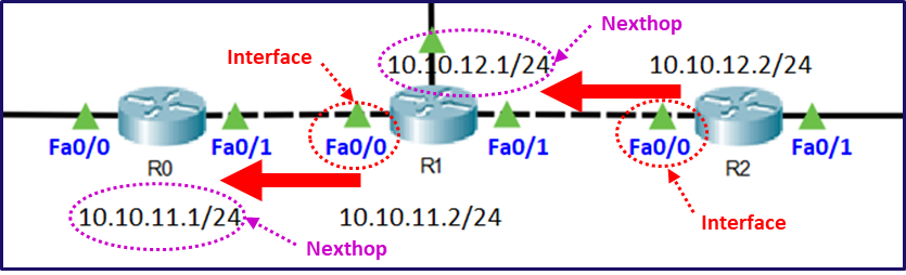 "Recursive lookup으로 출구 interface를 찾는다"는 의미는 원격지 IP를 nexthop으로 설정한 경우에도 Ethernet Frame은 직접 연결된 인접 라우터를 통해서 간접 전달이 되어야 하므로, directly connected 관계인 인접 라우터의 IP와 해당 네트워크 Interface가 recursive lookup에 의해서 검색되어야 한다는 의미입니다. 그림12의 R0 라우터에서 10.10.13.0/24 네트워크에 대한 nexthop을 직접 연결된 라우터 R1이 아니라, R1을 통해서 연결된 원격지 라우터 R2의 10.10.12.2를 nexthop으로 설정하는 경우에 recursive lookup에 의해서 10.10.12.2/24 네트워크에 대한 nexthop이 그림12의 4와 같이 직접 연결된 인접 라우터 R1의 10.10.11.2가 nexthop으로 검색 되어야 합니다.
