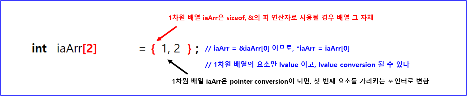 sizeof 연산자의 피연산자 그리고 단항 연산자 &의 피연산자로 배열이 사용될 때, 배열은 배열 그 자체로 사용됩니다. 그림2의 1차원 배열에서 sizeof (iaArr)의 결과는 붉은색 curly bracket, { } 이 나타내는 배열 전체의 크기입니다. &iaArr의 결과도 { } 이 나타내는 배열 전체 크기의 객체(object) 대한 pointer 입니다. iaArr이 sizeof의 피연산자 또는 단항 연산자 &의 피연산자가 아닌 경우에는 iaArr은 그림1에서 배열의 첫 번째 요소, iaArr[0], 즉, 정수 1을 담고 있는 객체를 가르키는 int 형 단일 포인터로 변환됩니다. 배열이 포인터로 변환되더라도 포인터를 저장할 수 있는 메모리 공간을 가진 변수가 아닌 단지 주소를 나타내는 rvalue입니다. 즉, 배열이 포인터로 변환되는 경우 포인터 변수가 아닌 포인터 상수로 변환됩니다. 따라서, 대입연산자의 좌항 피연산자로 사용될 수 없고, iaArr++ 이나 --iaArr과 같은 포인터 자체를 증감하는 연산도 불가능합니다.