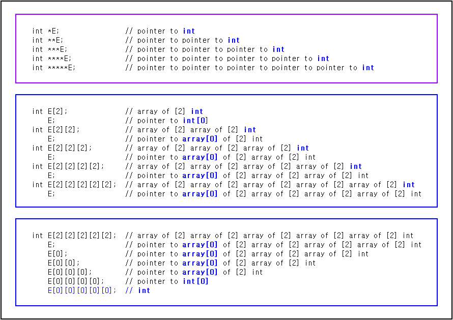 [오리뎅이의 C 포인터 이야기 - 4] 에서 포인터 배열과 배열 포인터의 차이를 알아 보았었고, 배열 포인터 만드는 방법도 확인해 보았었습니다. 기억을 되새김질해 보기 위해서 참조 자료를 소환합니다.