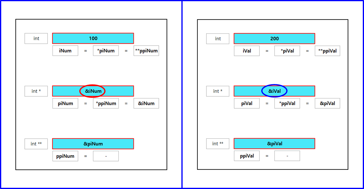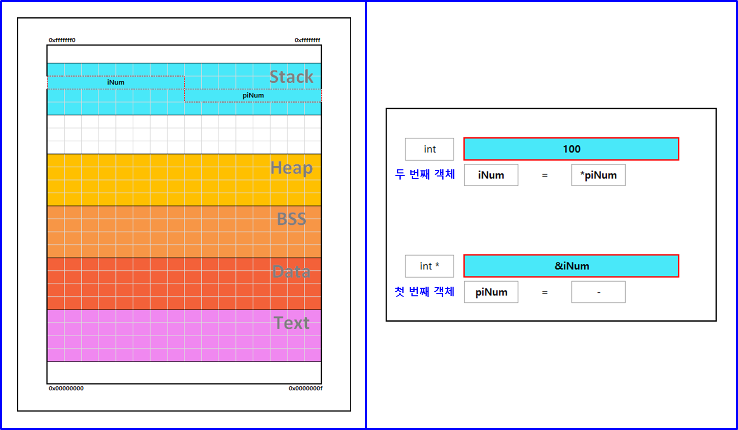 int *piNum = &iNum; // stack에 int * 변수 piNum 선언되고, &iNum으로 초기화